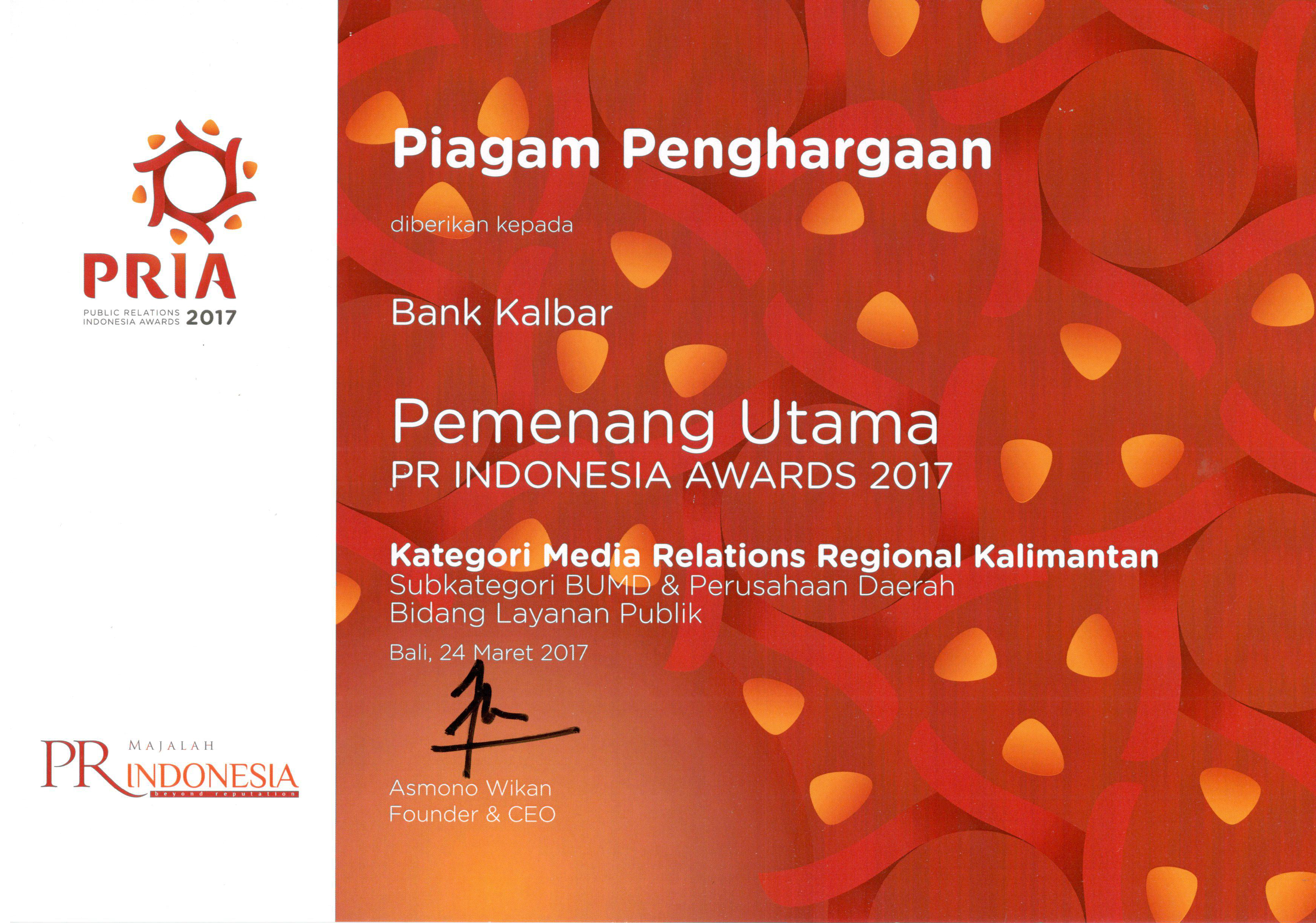 Public Relations Indonesia Awards (PRIA) Kategori Media Relations Regional Kalimantan.
